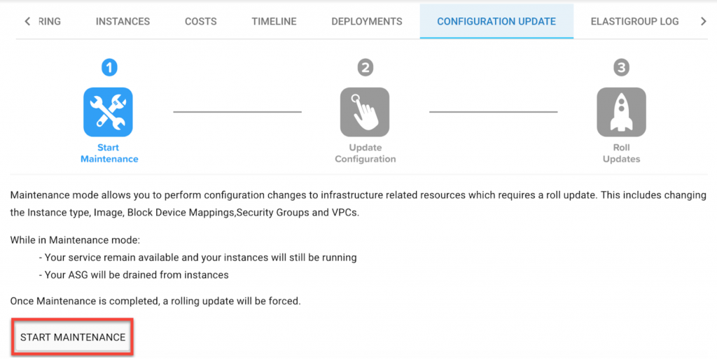 1. Open the Elastigroup Management View. Under Configuration Update click Start Maintenance.