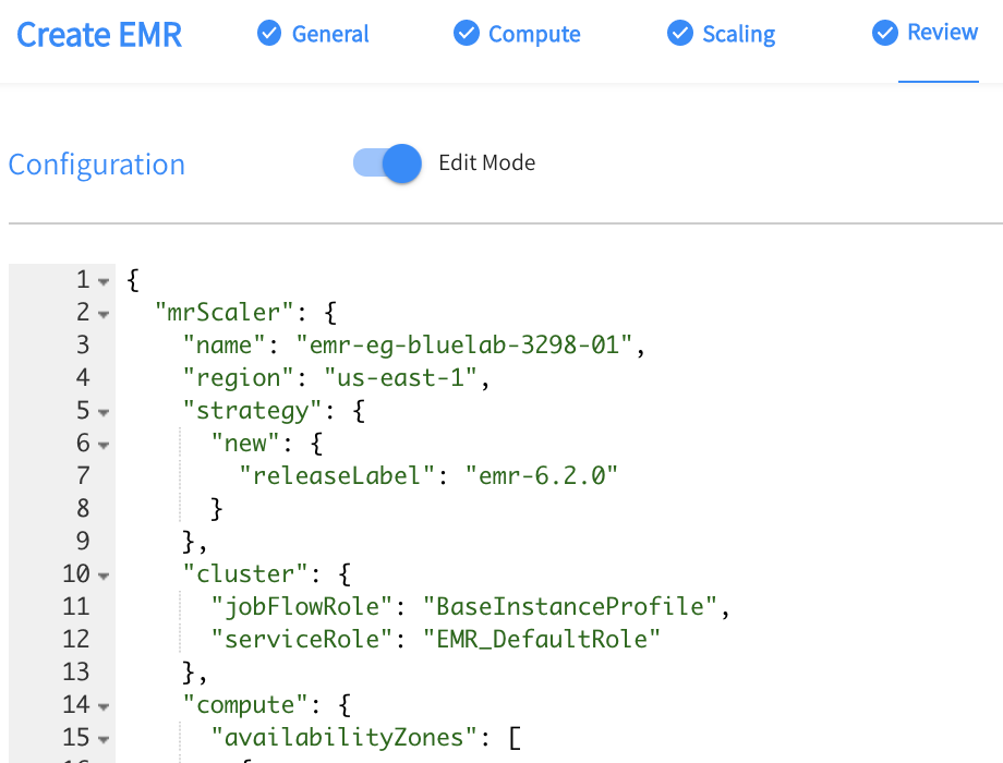 1. After you have entered all the information in the Compute and Scaling tabs, go to the Review tab JSON view and click Edit Mode.